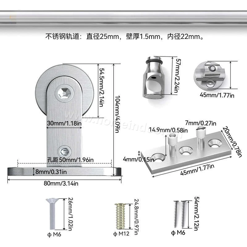 - Complete System Components A standard stainless steel sliding track system includes: Track/rail: A solid metal bar mounted to the wall or ceiling, acting as the sliding path. Rollers/hangers: Attached to the door, these allow it to slide along the track. Mounting brackets: Secure the track to the wall or ceiling. Door stops: Prevent the door from sliding off the ends. Anti-jump devices: Keep the door aligned and prevent derailment. Floor guide: Keeps the bottom of the door from swinging outward.