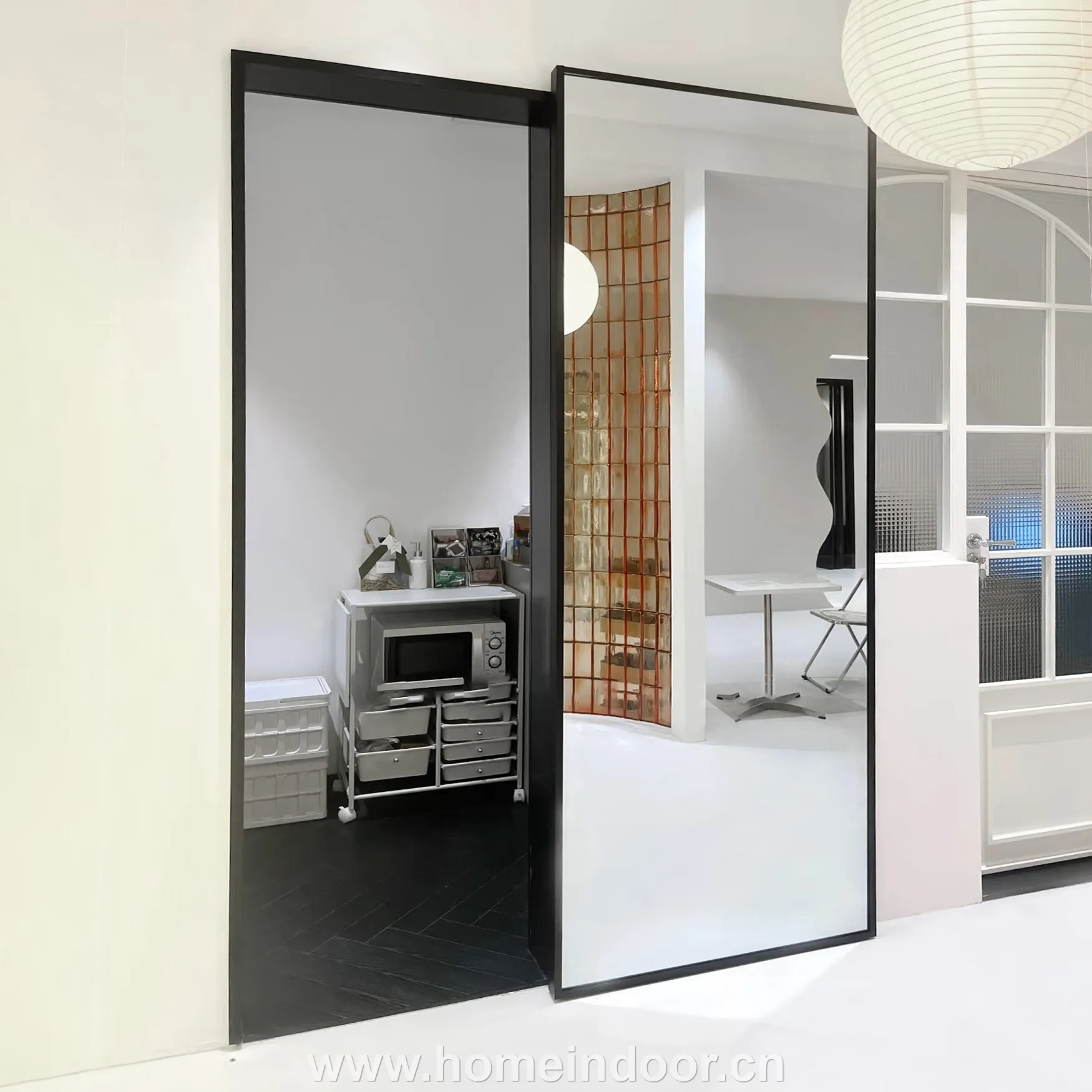 The mirror panel spans the entire face of the door, maximizing light reflection and enhancing the sense of space within the room—perfect for bedrooms, wardrobes, or dressing areas. The 3mm aluminum frame adds a subtle yet sophisticated border, ensuring durability while maintaining a slim, refined profile.