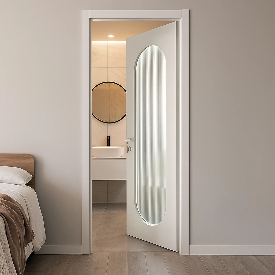 The bathroom door with pill-shape glass introduces a stylish and modern design to your bathroom space. The key feature of this door is its elegant pill-shape glass, which offers a more refined, soft silhouette compared to traditional rectangular glass panels. This unique shape adds a sophisticated touch that enhances the door’s aesthetic appeal, giving it a contemporary yet timeless look.