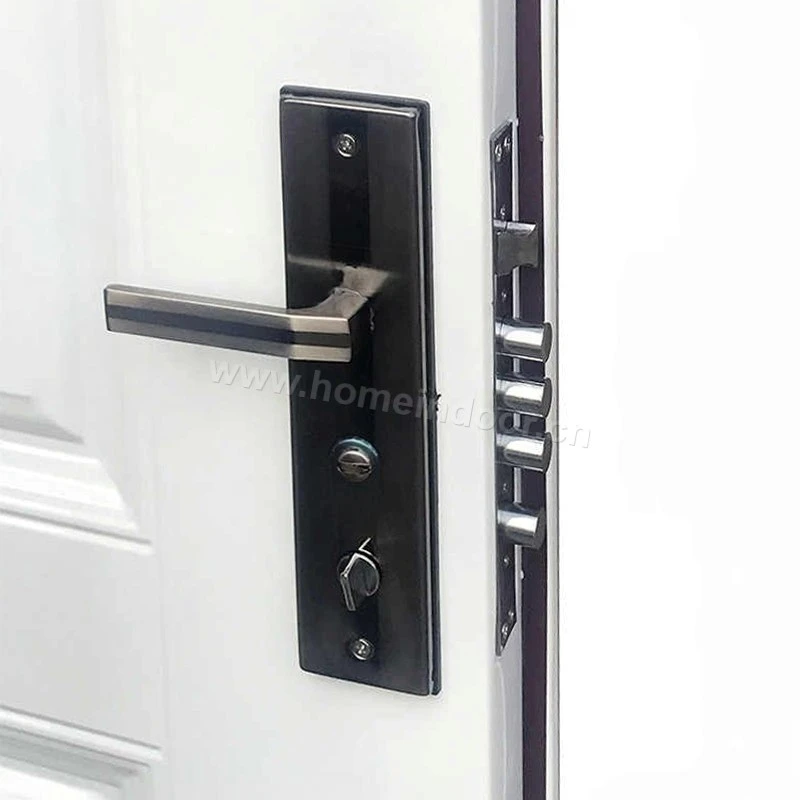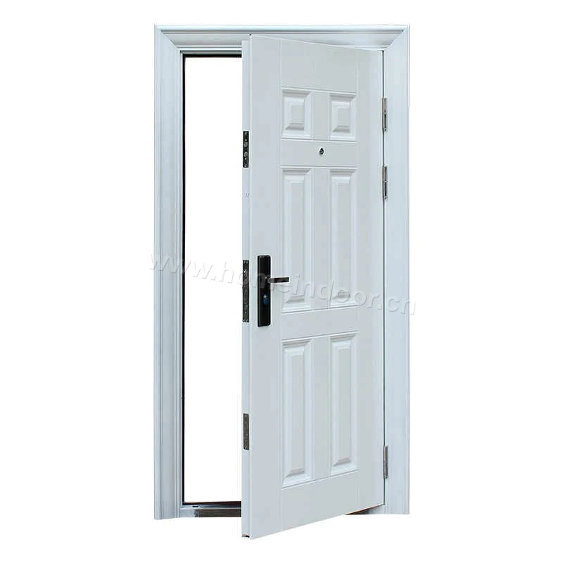 Aesthetically, the door is finished in a clean white color with a classic 6-square panel embossed design, bringing timeless elegance to any apartment setting. It comes equipped with a multi-point locking system for added security and can be easily upgraded to integrate a smart lock, offering modern convenience and improved access control.