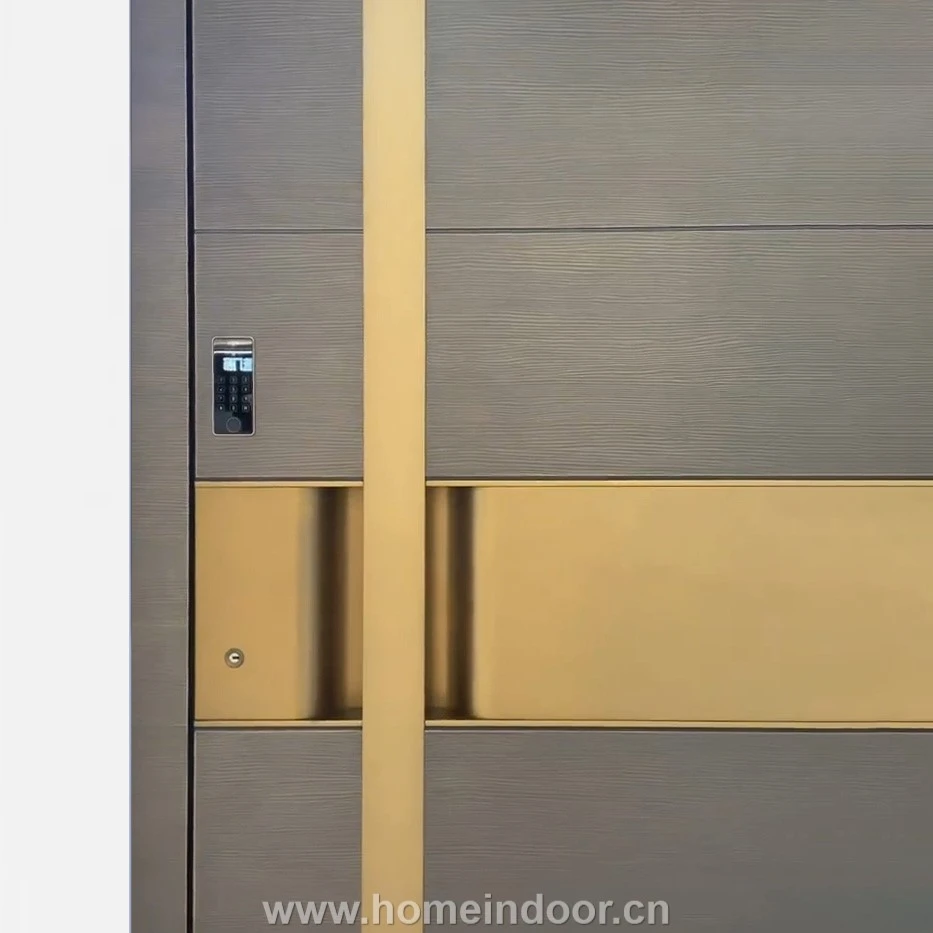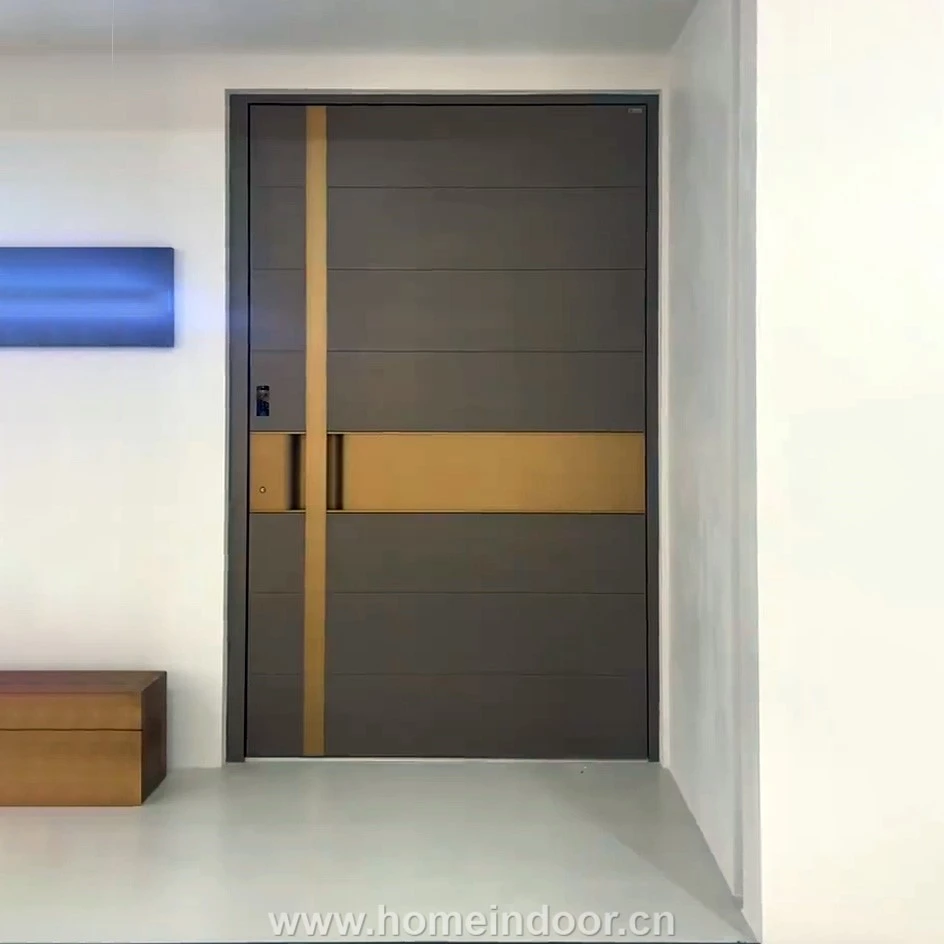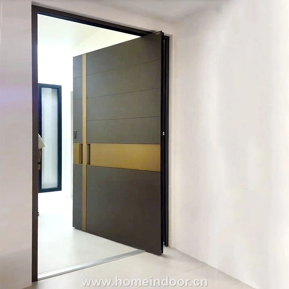 Stand at outside; Pivot hinge at left hand; lock at right hand, door swing to inside