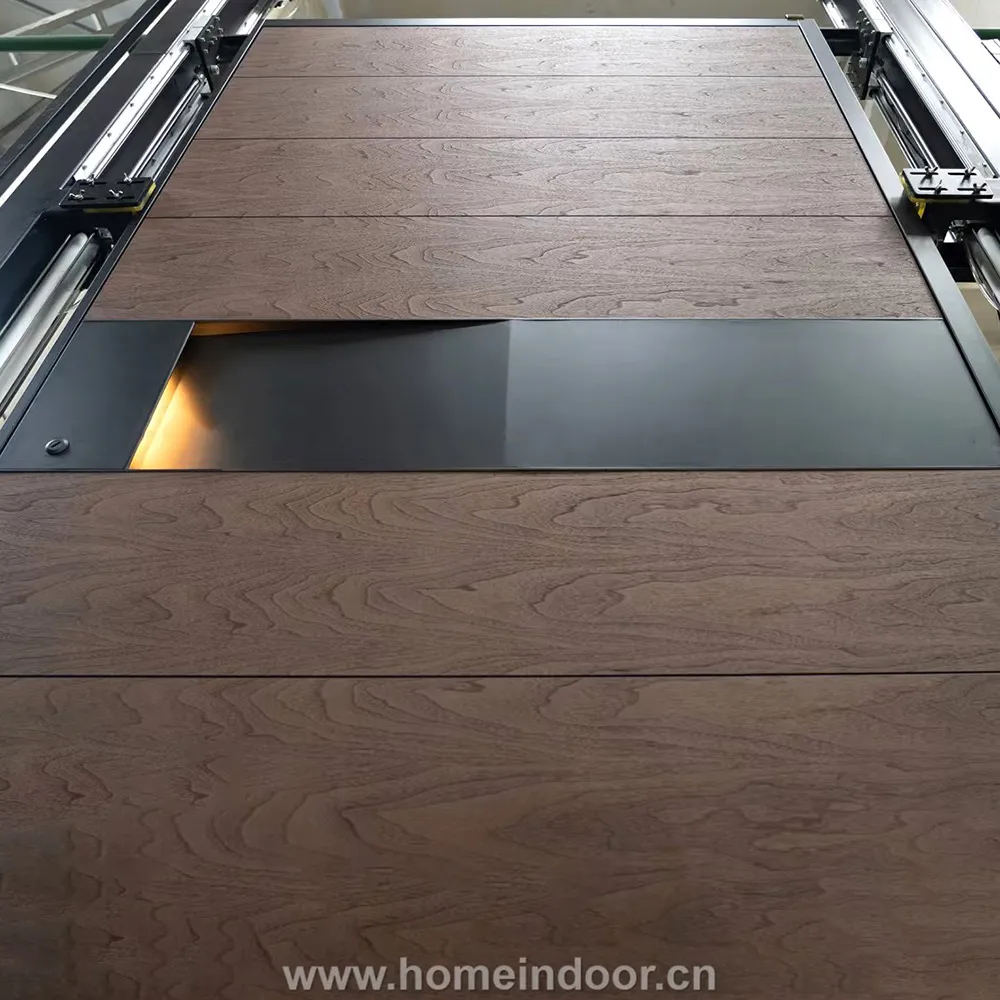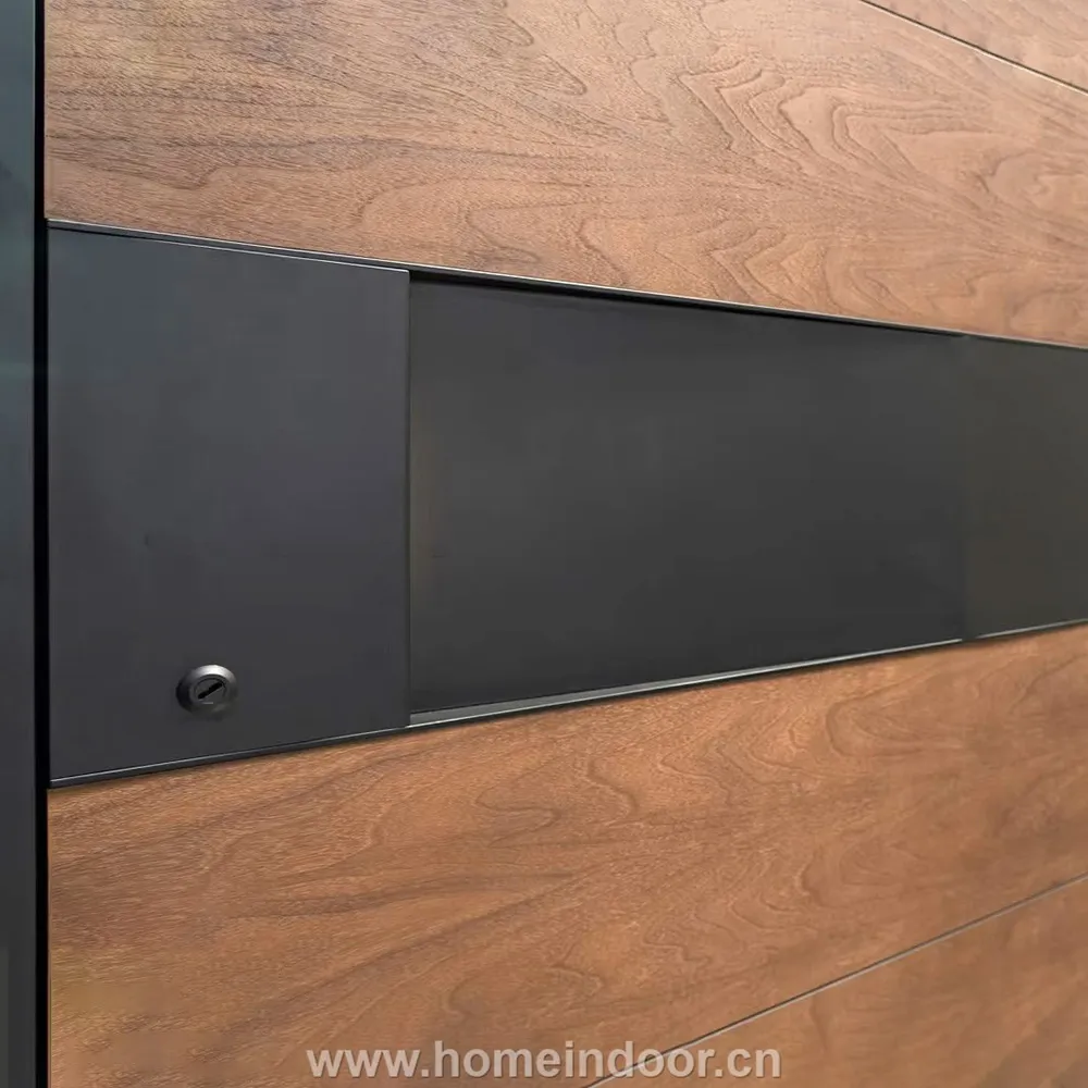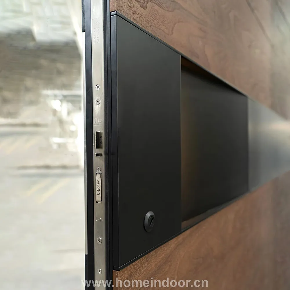 Unlike a traditional solid wood pivot door made of wood only, Metal security pivot front door use Reinforced Steel core with wood-clad wood for additional strength, it combine the strength of a steel core with the beauty of natural wood cladding; and if there’s a window panel, inset with Impact-rated glass