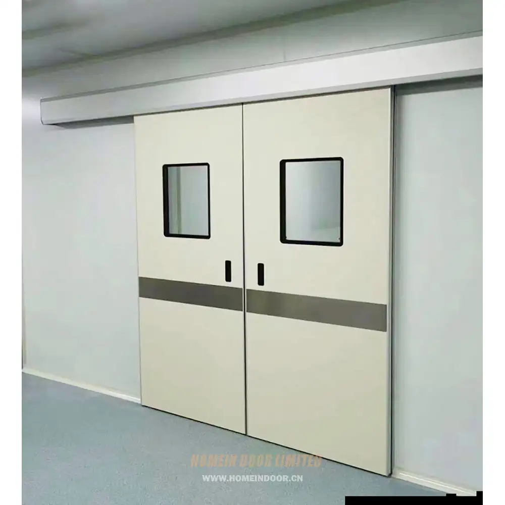 The door panels and frame are constructed from durable galvanized steel, offering excellent resistance to corrosion, impact, and cleaning chemicals. The double sliding configuration provides a wide clear opening, ideal for moving medical equipment and patient beds, while the hermetic sealing system ensures minimal air leakage to maintain sterility and air pressure differentials.