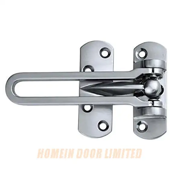 7 USDSolid metal swinging door guard offers the security of a bar with choice chrome-plated good looks. When bar is in security position