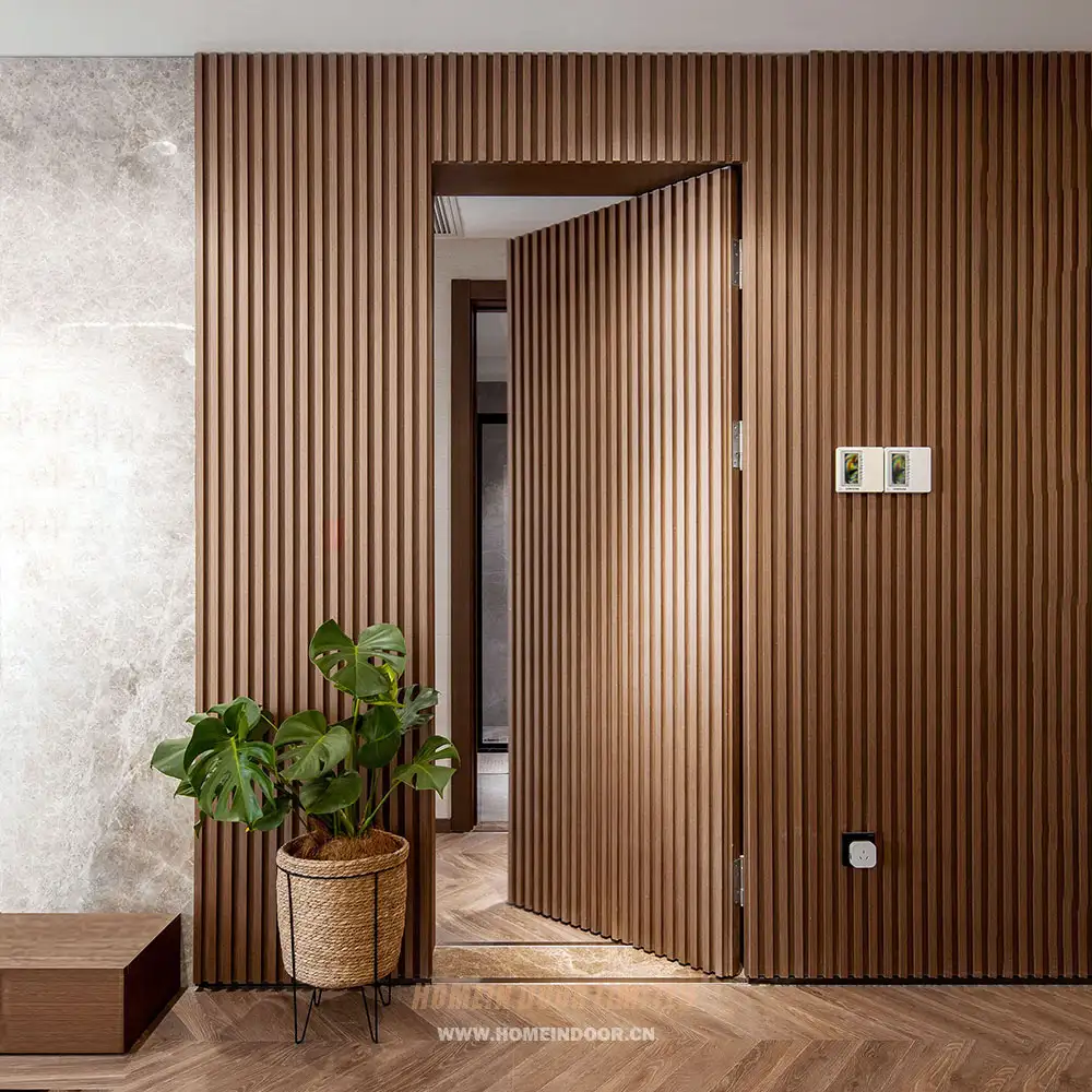 A fluted trimless hidden door is a type of concealed door system where the door panel aligns flush with the surrounding wall, creating a seamless, unbroken surface. Unlike standard doors, it eliminates visible trims, frames, and casings. The fluted wood finish—marked by its vertically grooved surface—adds a tactile and visual richness, transforming the door into a subtle design feature rather than a utilitarian object.