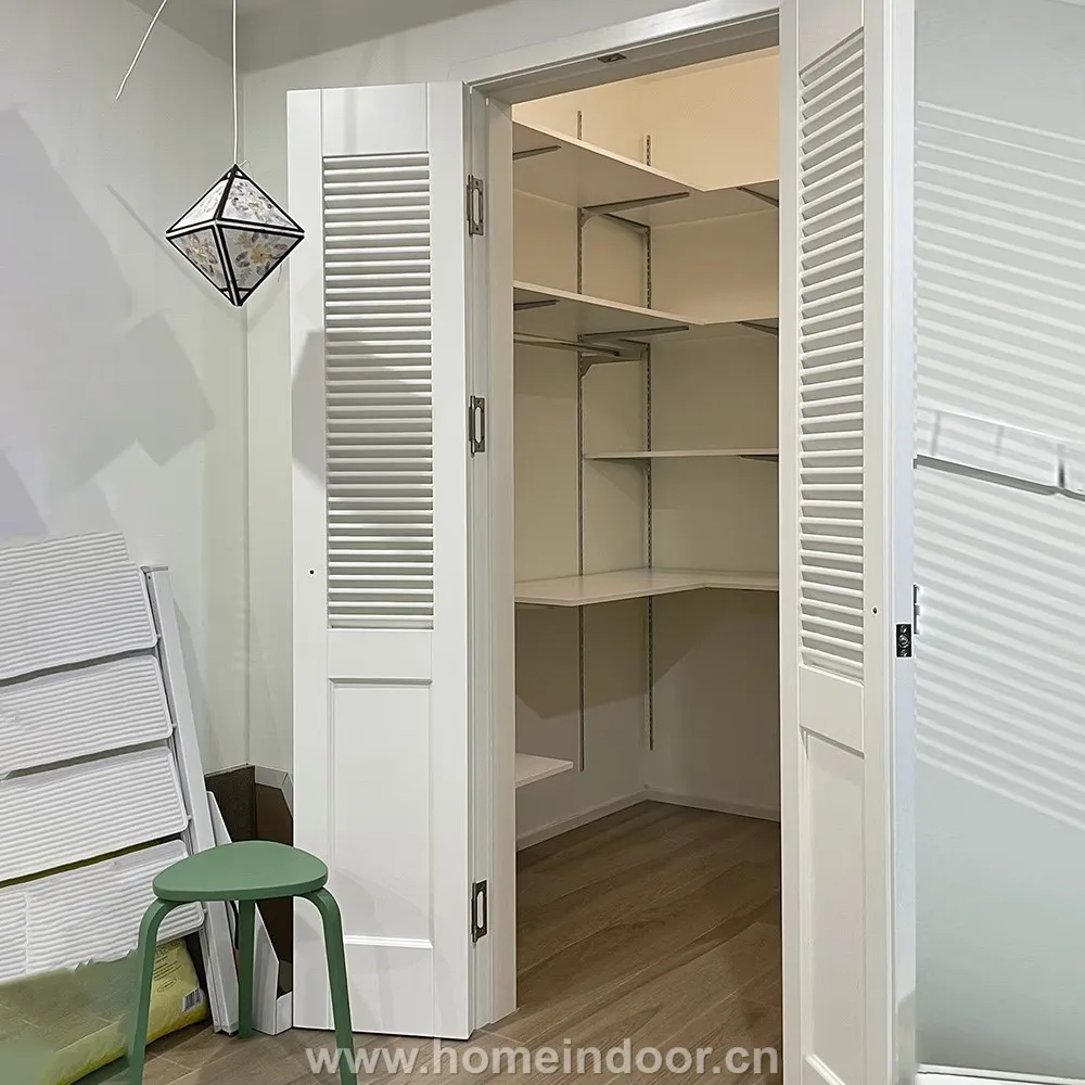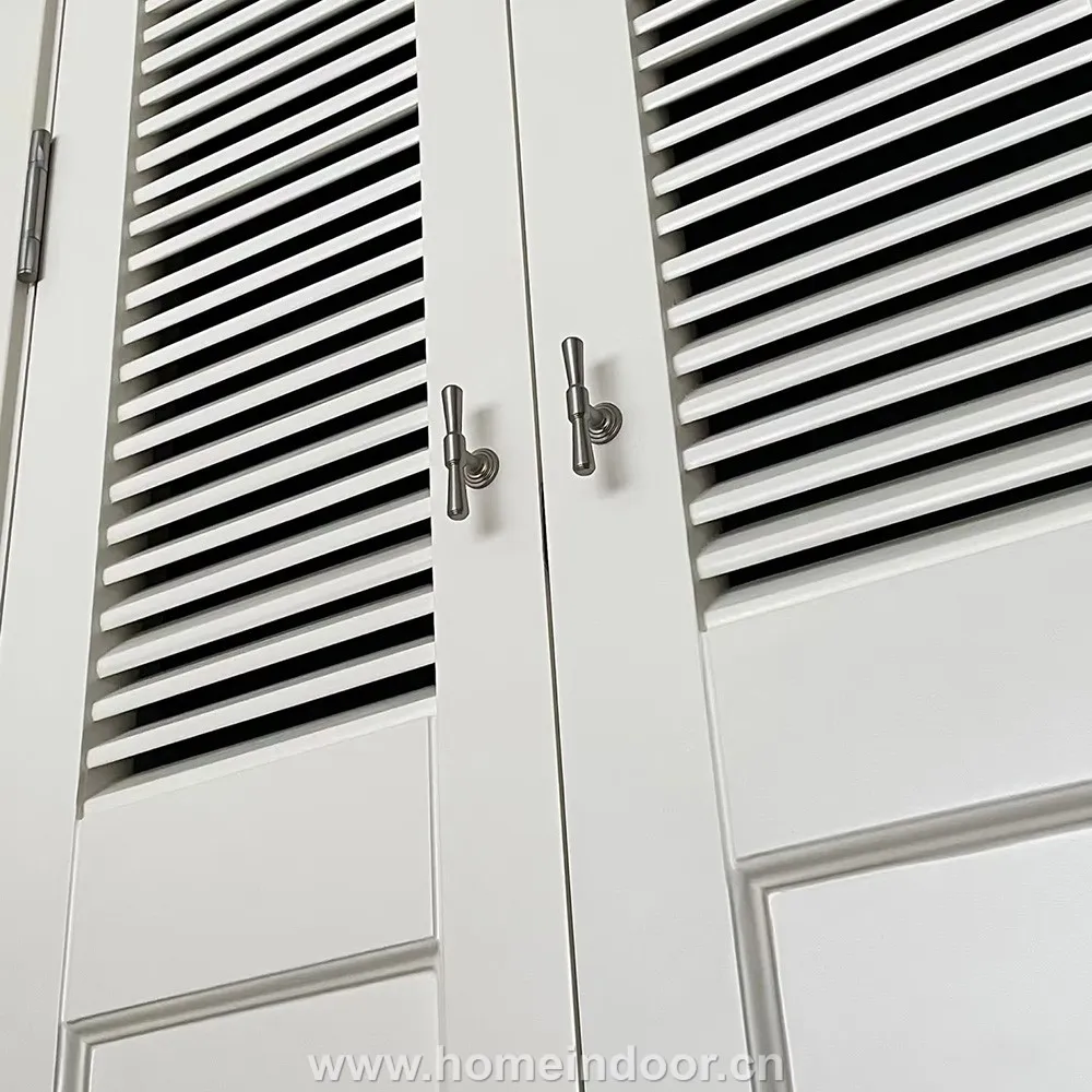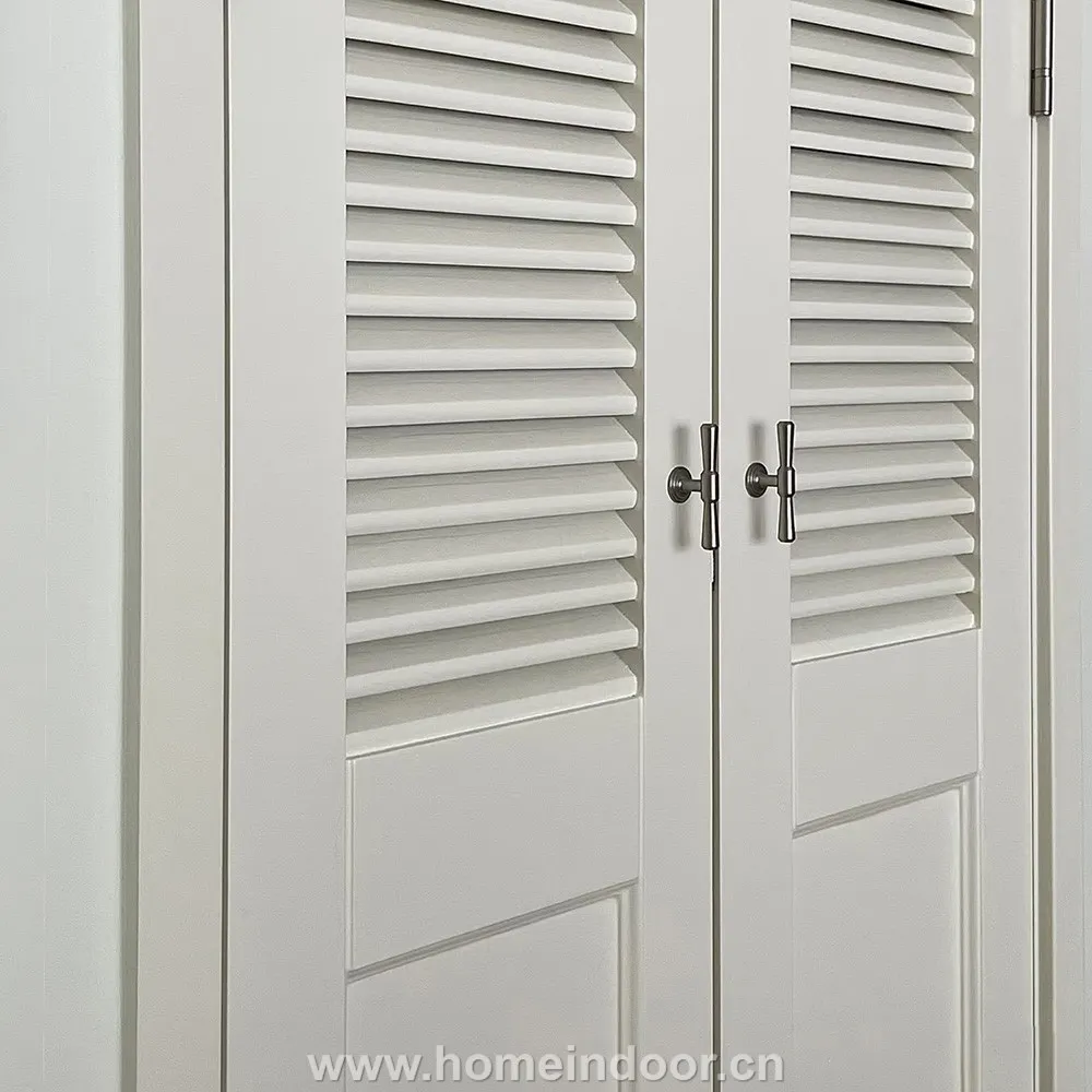 Fixed horizontal louvers on the upper portion of each door allow ventilation, helping prevent moisture buildup while keeping closet interiors fresh.