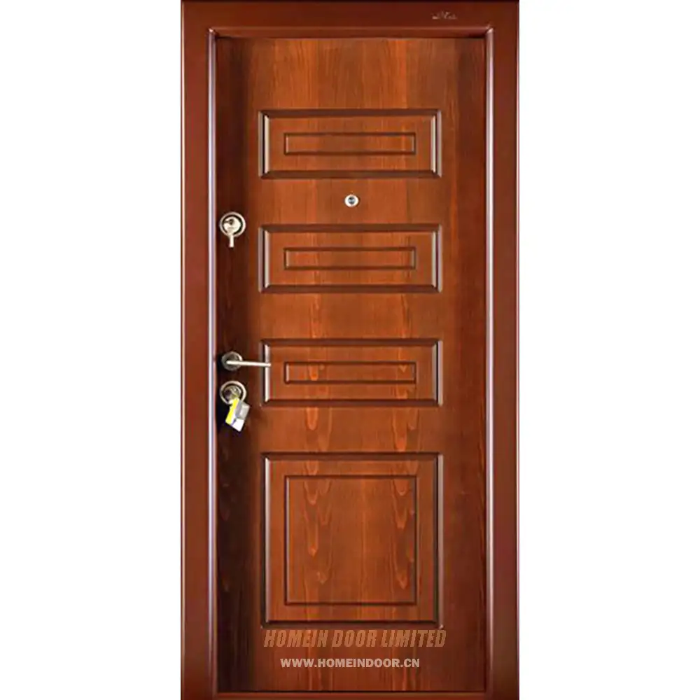 Pre:Residential external entry brown walnut veneer painted 6 panel steel-wood armour door