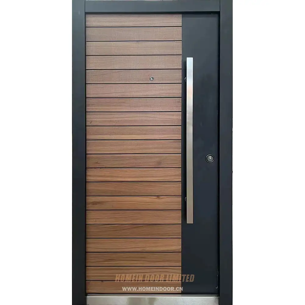 The exterior is finished with high-quality wood cladding, available in various grains and finishes such as natural oak, walnut, or teak, combining timeless beauty with modern protection. This cladding is weather-treated, UV-resistant, and securely bonded to the internal structure, preserving the door's appearance over time.
