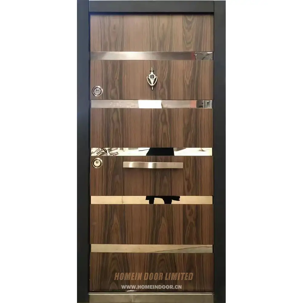 Pre:AMD38 Residential external entry brown oak veneer painted grooved steel-wood armored door