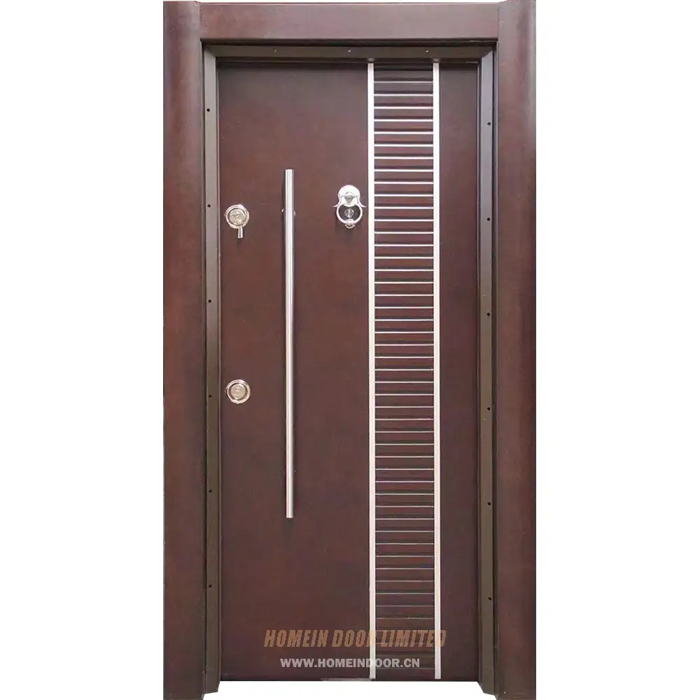 Pre:Residential exterior entrance modern brown painted grooved steel-wood armored door