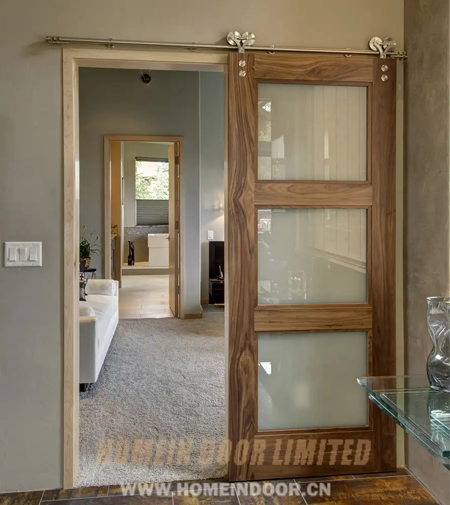 Whether you're upgrading a master suite or adding style to a guest bathroom, this walnut sliding barn door with frosted glass delivers elegance, privacy, and high-end design in one versatile piece.
