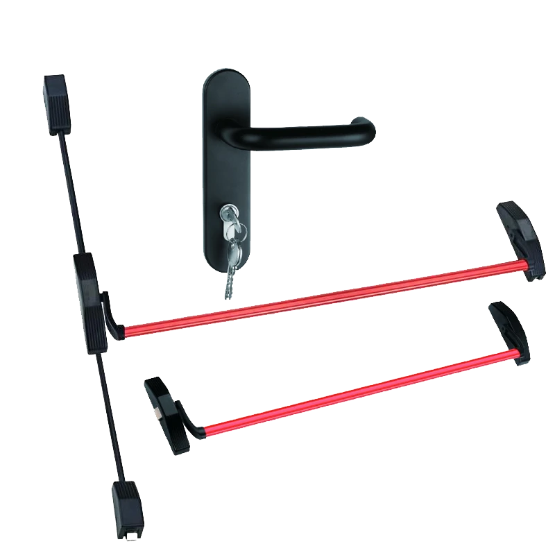 A double door push bar device with vertical rod is a panic hardware system designed to allow easy exit in emergency situations while maintaining security and functionality for everyday use. This device typically includes a horizontal push bar across two doors, along with vertical rods that engage the latching mechanism at the top and bottom of the doors.