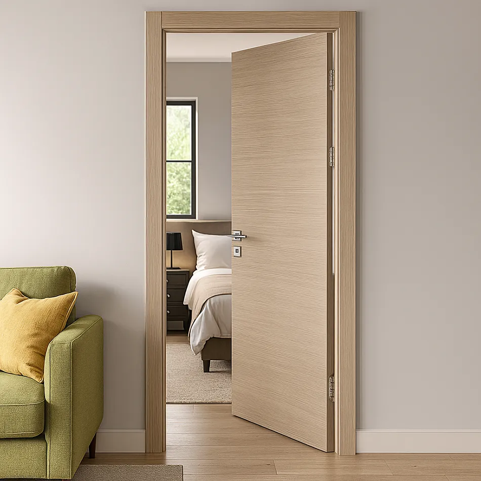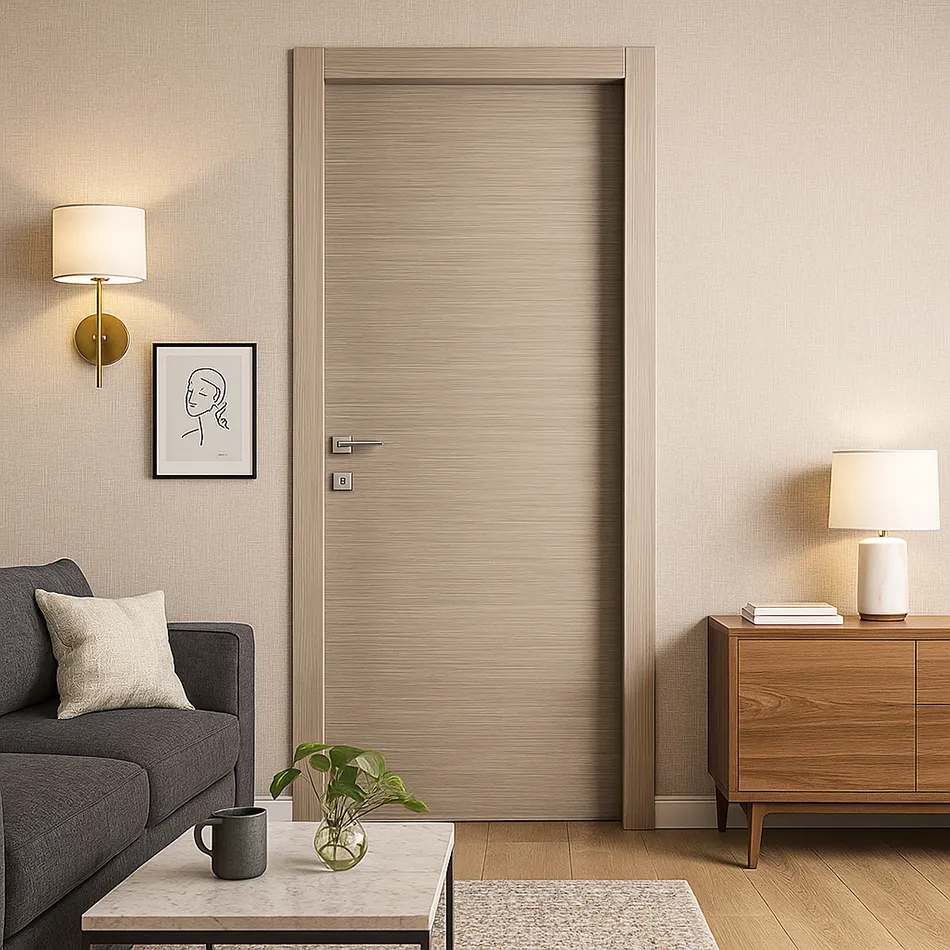 A modern flush wood laminate interior door is designed specifically for contemporary interior spaces like bedrooms, living rooms, or offices, where a sleek and minimalist aesthetic is desired. The door features a flush design, meaning it has a smooth, even surface without raised panels or intricate detailing. This makes it ideal for modern interiors that emphasize clean lines and simplicity.