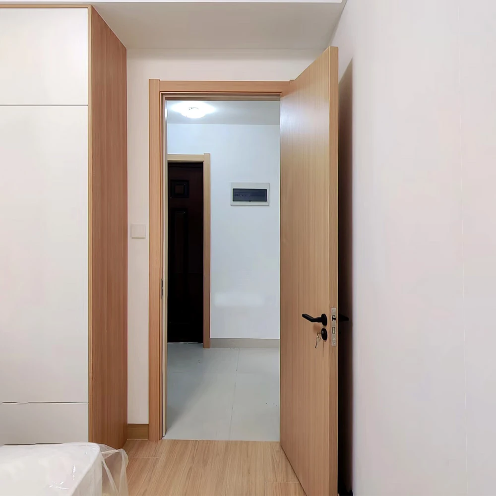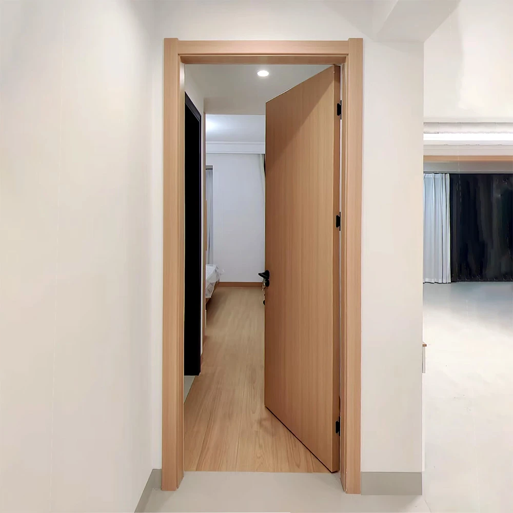 The door is built on an engineered wood frame and offers two optional hollow core types—lightweight honeycomb paper for economical performance or wood batten for added durability. The melamine surface is highly resistant to scratches and stains, making it a practical, low-maintenance solution for residential applications. Its flush panel design ensures a clean, modern finish that complements minimalist and transitional interiors.