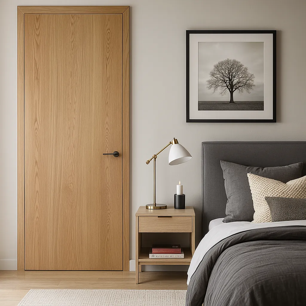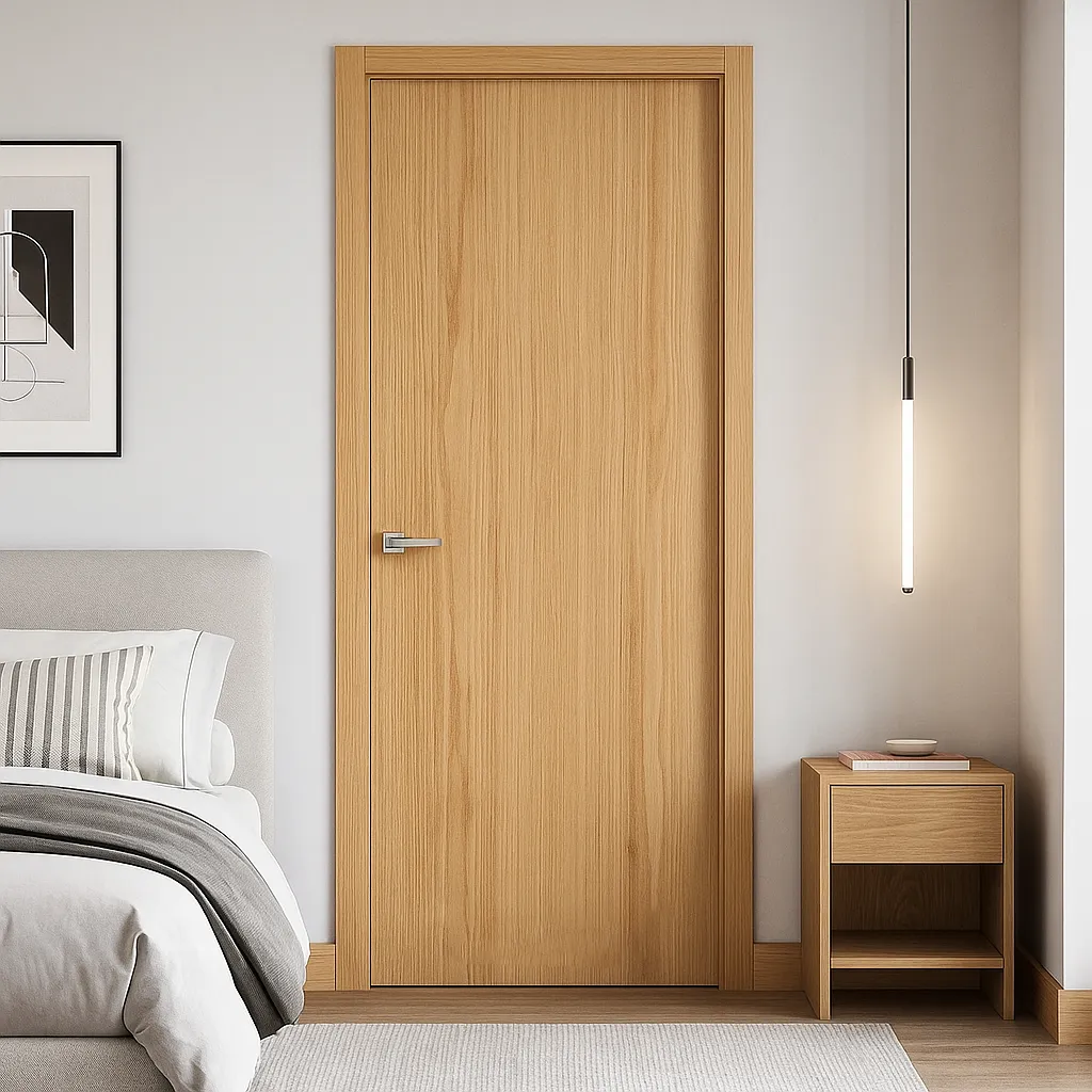 The Sliced Oak Wood Flush Panel Interior Door is a sleek, minimalist design ideal for modern interior spaces like bedrooms, closets, and other private rooms. Its clean, flat surface creates a sophisticated and contemporary look, free from grooves or raised panels, making it the perfect choice for those seeking a smooth, understated aesthetic in their home. This minimalist design is highly popular in modern interior decor for its simplicity and elegance.