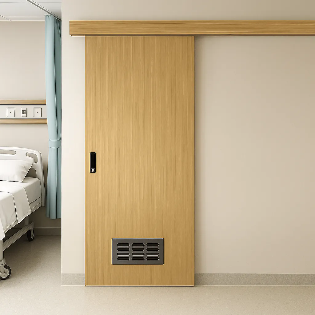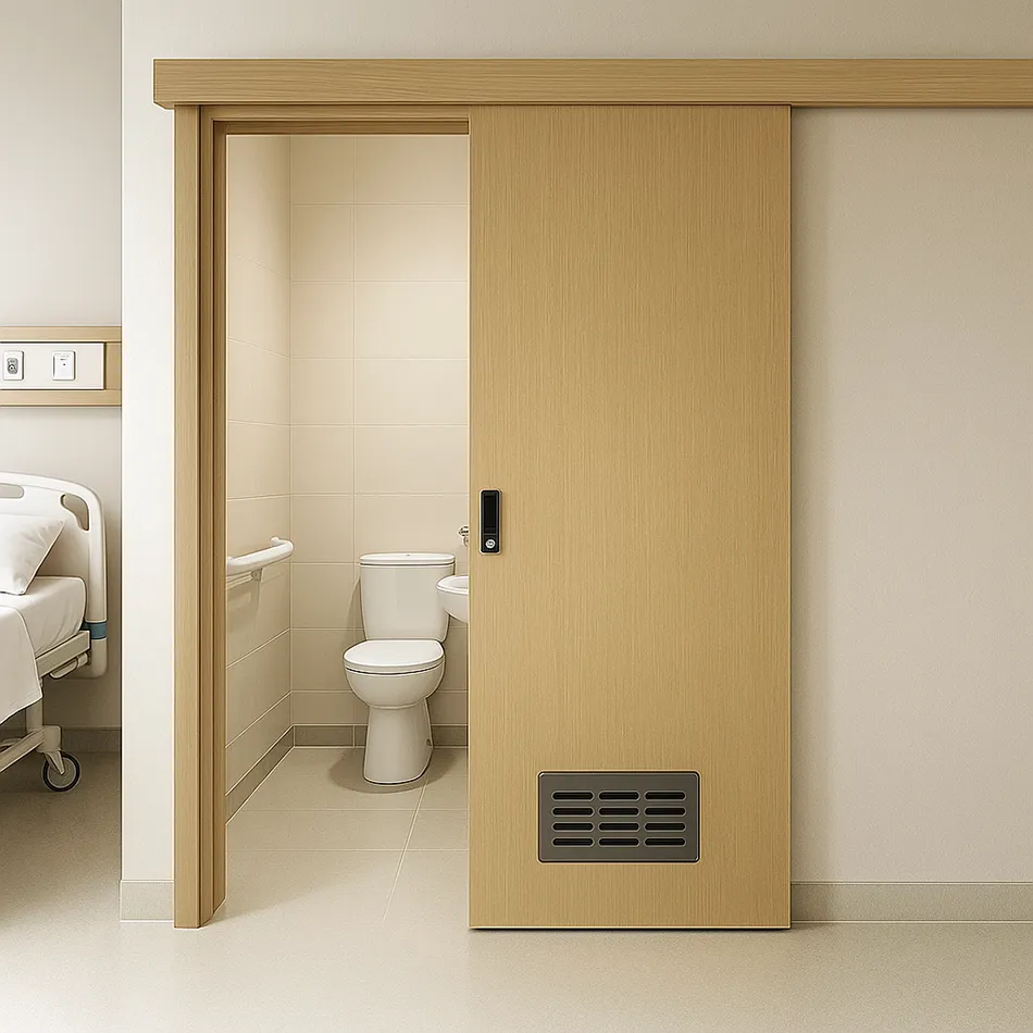 A key feature of these sliding bathroom doors is the inclusion of an air louver at the bottom. This small but effective design element allows for proper ventilation, helping to regulate air flow in the bathroom. The louver helps to maintain a fresh environment by allowing odors and excess humidity to escape, promoting better air quality and a more comfortable atmosphere for the patient.