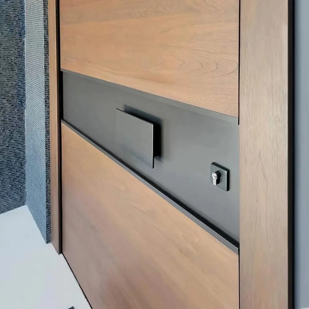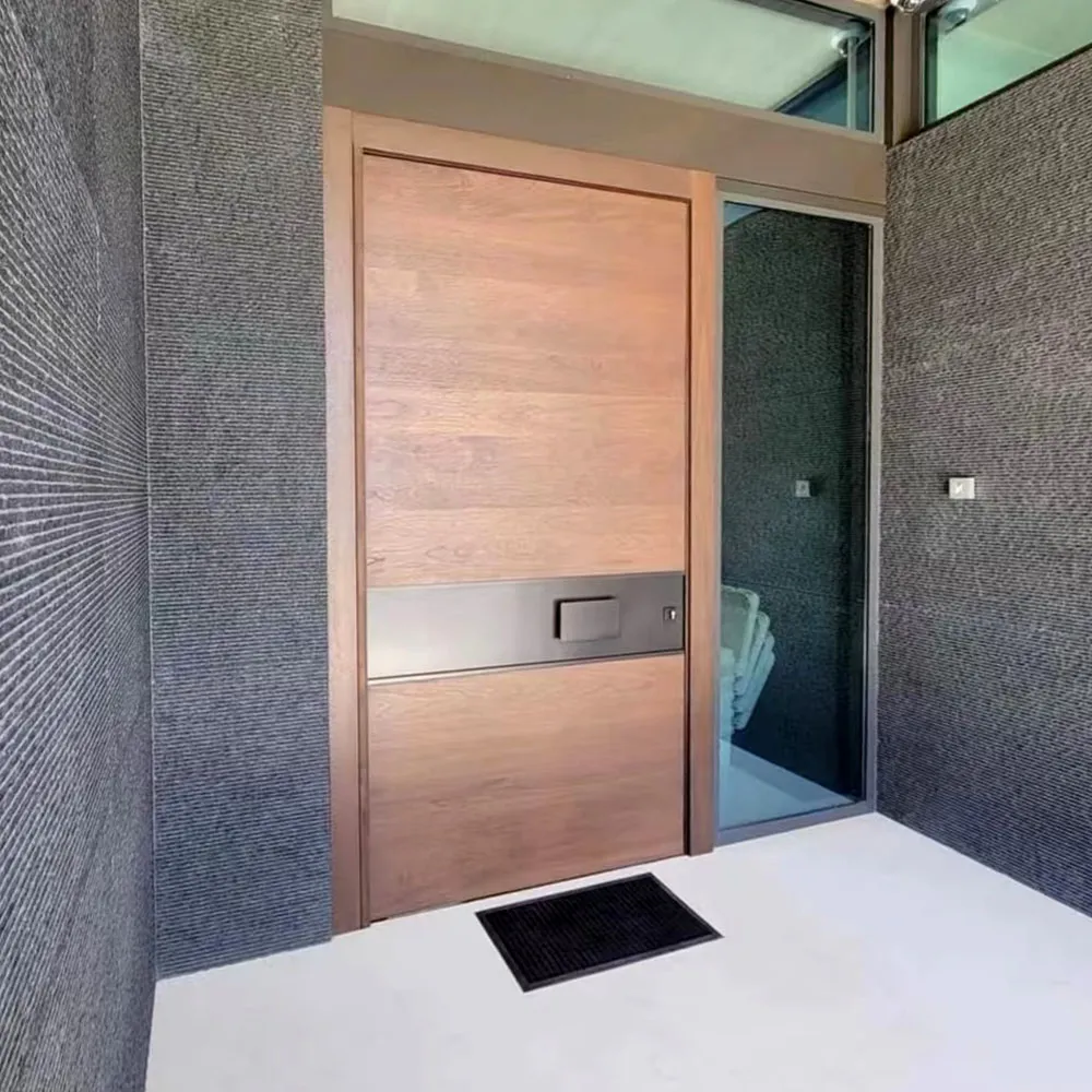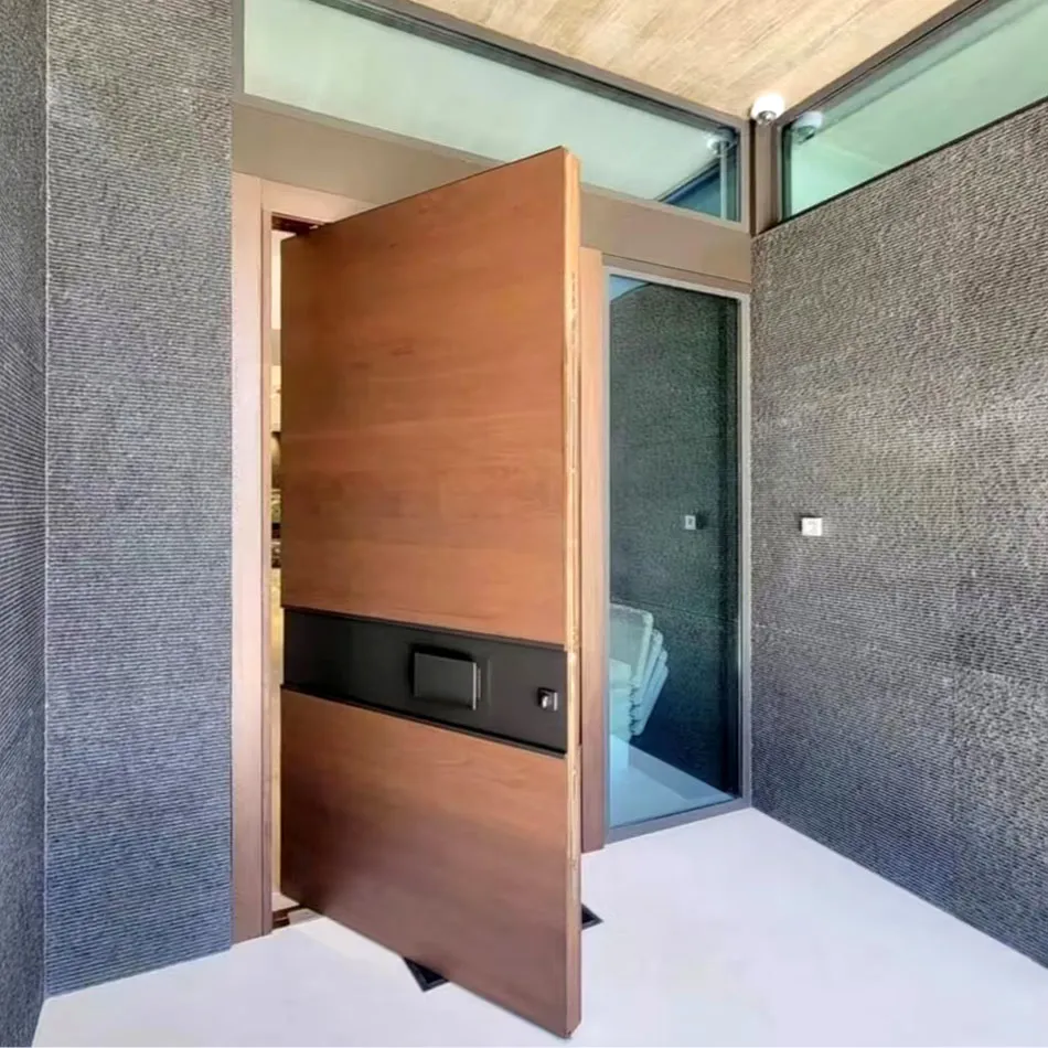 Pre:Residential exterior Solid walnut wood pivot front door with glass