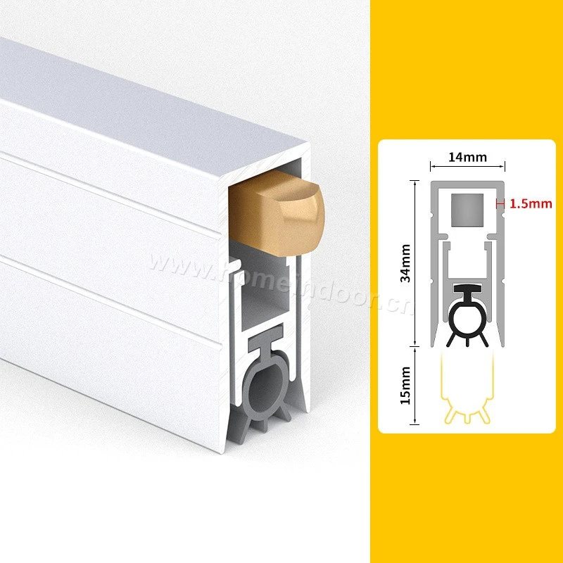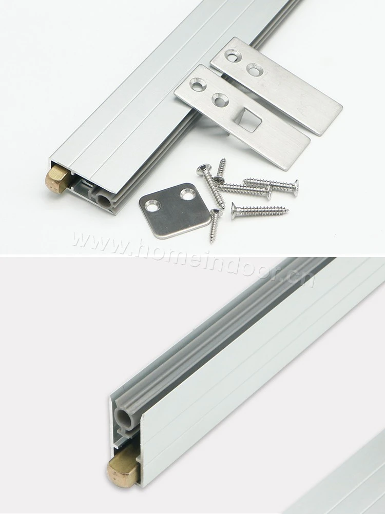 A concealed automatic drop-down seal with an aluminum profile is a compact, self-adjusting sealing mechanism that is embedded into the bottom edge of a door. When the door is closed, the seal automatically drops down to close the gap between the door and the floor. When the door is opened, the seal retracts back into the door, ensuring smooth operation and maintaining a clean appearance.
