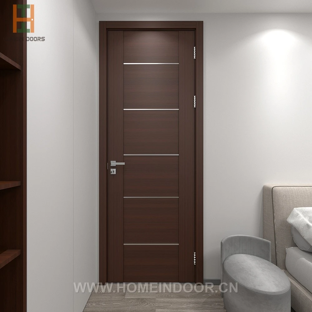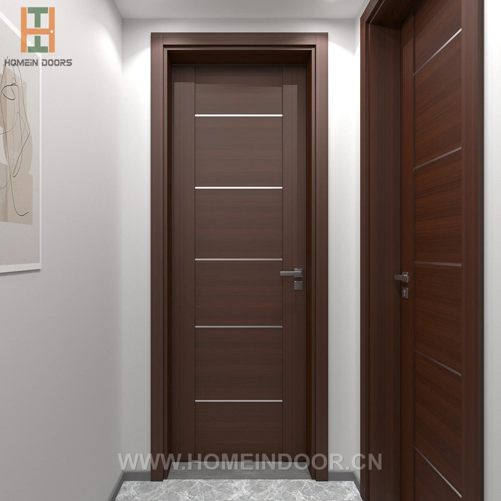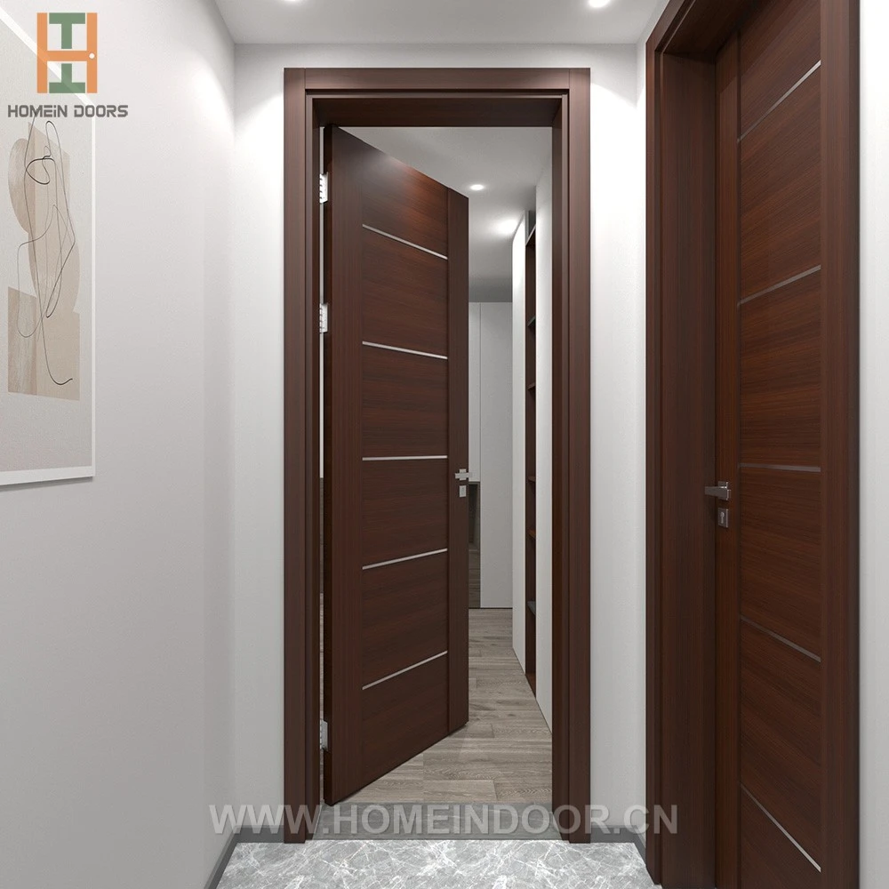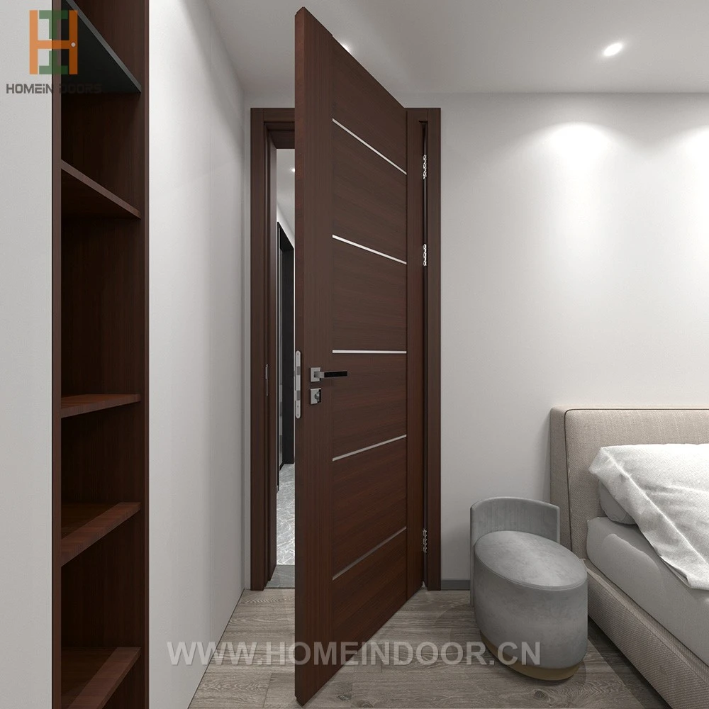 Crafted from premium materials, the door's core is constructed from stable engineered wood or solid timber, ensuring durability and warp resistance. The surface is finished with a rich brown wood veneer, selected for its natural grain character and warm tonal variations. A precision-cut chrome metal inlay borders the central panel, creating a striking contrast against the wood's organic texture while adding structural definition.